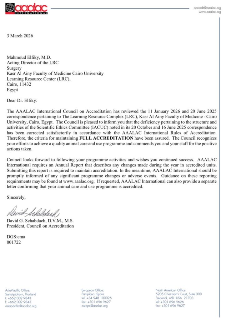 اعتماد دولي لمجمع التعليم والبحوث الحيوانيةبطب قصر العيني من منظمة AAALAC