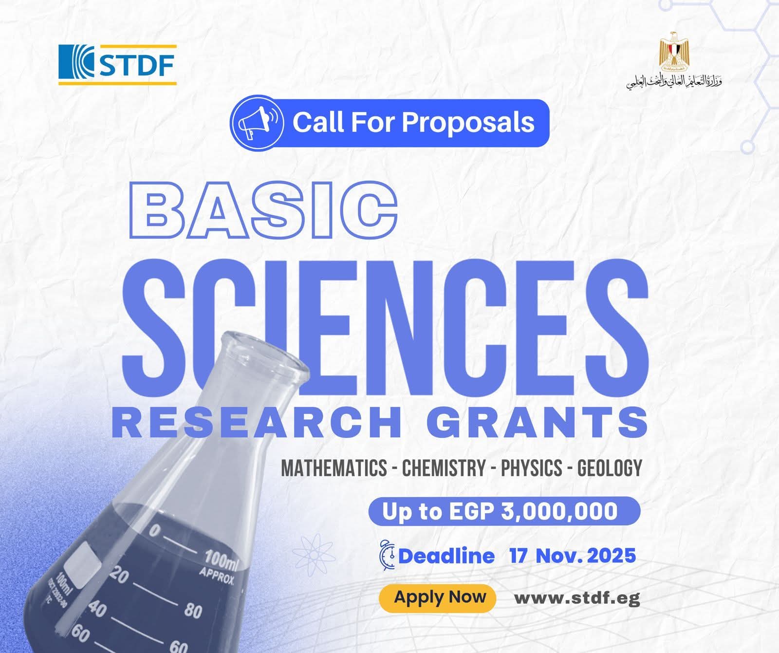 في هذا الإطار، تعلن هيئة تمويل العلوم والتكنولوجيا والابتكار (STDF) عن فتح باب التقدم للنداء البحثي الرابع لبرنامج العلوم الأساسية، والذي يهدف إلى تحفيز البحث العلمي في هذا المجال الحيوي، وبناء مجموعات بحثية مبتكرة قادرة على مواجهة التحديات، بما ينعكس إيجابيًا على جودة البحث العلمي وأثره في مصر.
