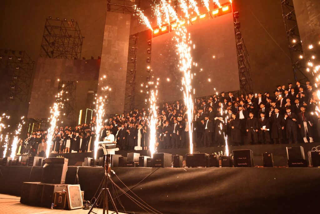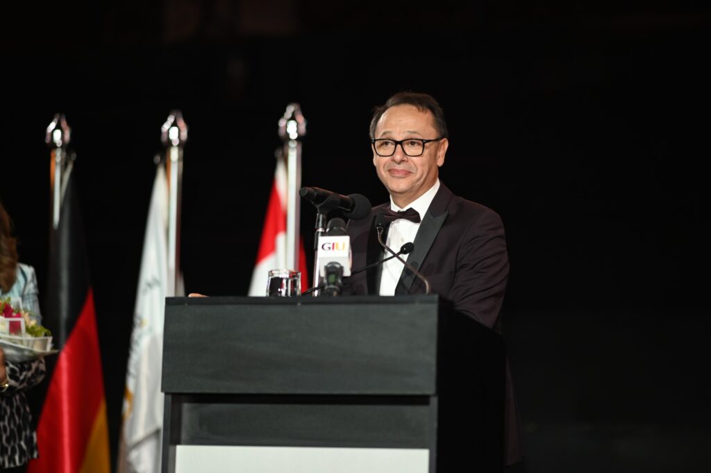بدأت مراسم الإحتفالية بعزف السلام الجمهورى لمصر وألمانيا ، أعقب ذلك كلمة من جانب الدكتور منصور أشاد خلالها بالحضور وأعلن إطلاق تسمية هذه الدفعة من خريجي عام 2025 “سفراء الامل والسلام” ، مؤكداً بأنه يشارك في هذه الإحتفالية العديد من الهيئات المصرية والألمانية و الدولية لكونها تمثل نقطة فاصلة في حياة الخريجين، فهي تمثل لنا ولكم أيها الخريجين مستقبل واستقرار لأوطانكم ومجتمعاتكم في مصر والمانيا والعالم بل تعد نقطة إرتكاز لتجربة فريدة تؤكد نجاح التعليم الألماني العالي في مصر العابر للحدود يستشعره الجميع في مصر و المانيا ، فنسبة الشهادات الألمانية الممنوحة لخريجي الجامعتين GUCو GIU تمثل ما يقرب من 60% من الشهادات الألمانية العابرة للحدود على مستوى دول العالم.