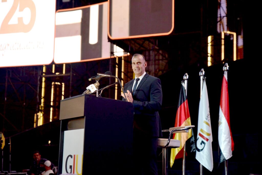 كماشارك في الاحتفالية السيد اندرياس فيدلر نائب السفير الألماني بالقاهرة ، الذي أكد أن خريجي الجامعة الألمانية الدولية (GIU) يمثلون جيلًا جديدًا من القادة والمبدعين القادرين على صياغة مستقبل أكثر ازدهارًا واستدامة، وتجسيد لعمق الشراكة بين مصر وألمانيا في مجالات التعليم والابتكار والتنمية ، مشيرًا إلى أن العالم الذي يستقبلهم مليء بالفرص ولكنه يتطلب من الشباب أن يكونوا أكثر وعيًا بمسؤوليتهم كمواطنين عالميين قادرين على الابتكار والتأثير الإيجابي ، وأوضح أن السنوات التي قضاها الطلاب في الجامعة كانت تجربة ثرية بالتحديات والفرص، أسهمت في بناء مهاراتهم وتنمية قدراتهم لمواجهة متطلبات المستقبل بثقة وكفاءة.
