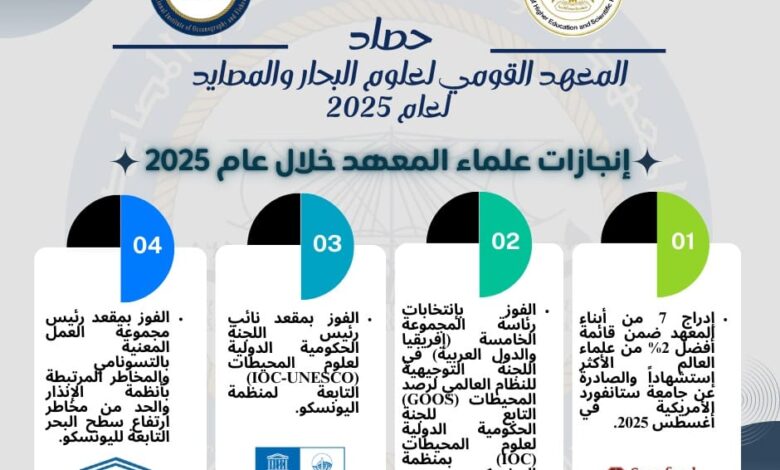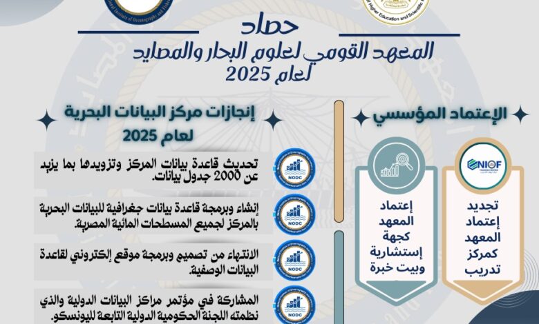 شهد عام 2025 حصادًا متميزًا للمعهد القومي لعلوم البحار والمصايد، بما يعكس الجهود المتواصلة لباحثي المعهد وكوادره العلمية، والتوجه الاستراتيجي نحو التميز البحثي، وتعزيز التعاون الدولي، وربط البحث العلمي بقضايا التنمية المستدامة، ودعم مكانة مصر الريادية في مجالات علوم البحار والمصايد على المستويين الإقليمي والدولي.