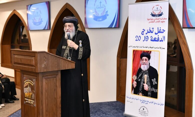 شهد قداسة البابا تواضروس الثاني مساء اليوم السبت، حفل تخريج الدفعتين ١٩ و ٢٠ من معهد الكتاب المقدس التابع لإيبارشية المعادي، الذي أقيم في المقر البابوي بالقاهرة، بحضور نيافة الأنبا دانيال مطران الإيبارشية، وعدد من الآباء الكهنة وأعضاء هيئة التدريس وأسر الخريجين.