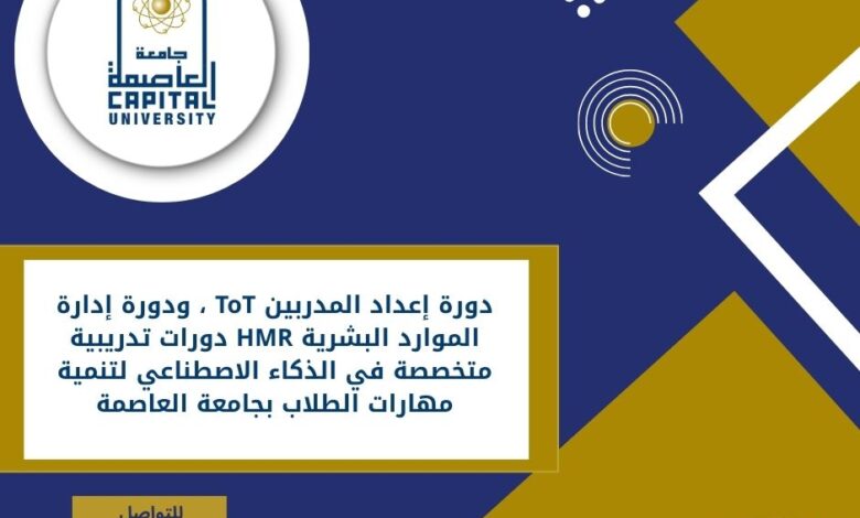 أعلنت وحدة برامج التنمية البشرية بالإدارة العامة لرعاية الطلاب عن تنظيم دورتين تدريبيتين متخصصتين،في إطار توجه جامعة العاصمة نحو التطوير وبناء القدرات البشرية تزامنًا مع العام الجديد 2026 – عام التطوير والاستحقاق، هما: