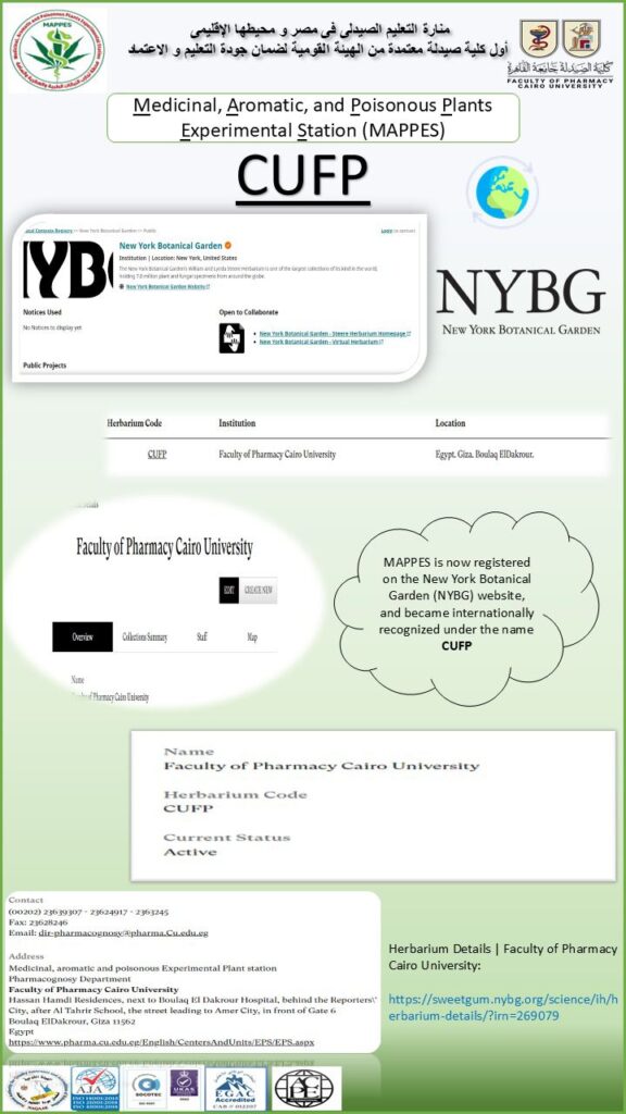 أعلنت كلية الصيدلة بجامعة القاهرة تسجيل محطة تجارب النباتات الطبية والعطرية والسامة التابعة للكلية ضمن الكود الدولي للمعشبات على موقع New York Botanical Garden (NYBG)، لتصبح معترفًا بها عالميًا تحت الاسم الدولي CUFP.