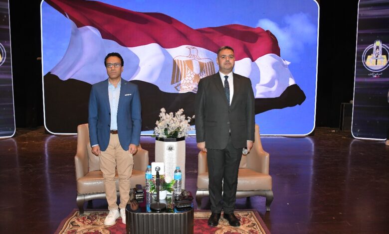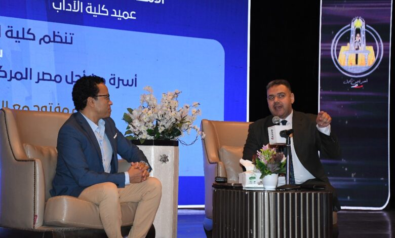 الدكتور السيد قنديل رئيس جامعة حلوان يلتقي الفنان سامح حسين في ندوة "دور الفن في القضايا الاجتماعية".