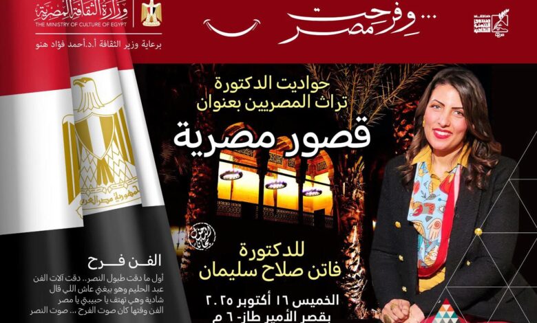 تحمل الأمسية عنوان “قصور مصرية”، وتقدمها الدكتورة/ فاتن صلاح سليمان، أستاذ تاريخ العمارة والتراث بكلية الهندسة وعضو هيئة خبراء التراث العرب، من خلال صالونها الثقافي “حواديت الدكتورة”.