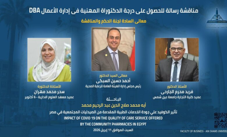 كلية التجارة بجامعة عين شمس تناقش رسالة دكتوراه حول تأثير كوفيد-19 على جودة خدمات الصيدليات المجتمعية بحضور رئيس هيئة الرعاية الصحية