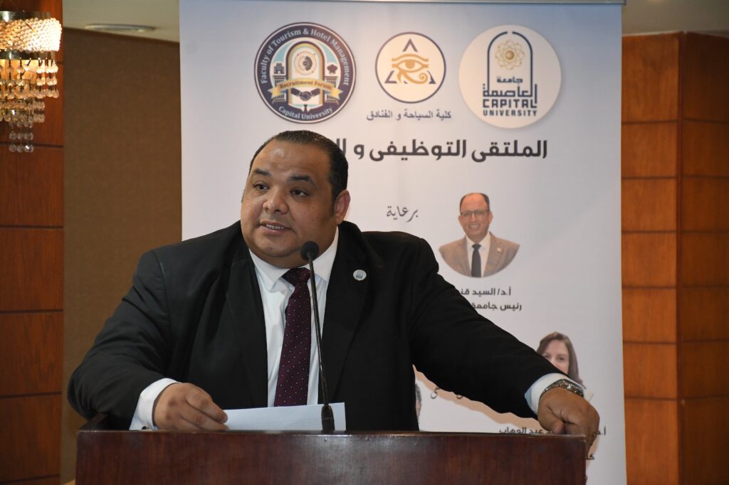 نظمت كلية السياحة والفنادق جامعة العاصمة الملتقى التوظيفي والتدريبي لخريجي وطلاب الكلية، وذلك تحت رعاية الدكتور السيد قنديل رئيس جامعة العاصمة، و الدكتور وليد السروجي نائب رئيس الجامعة لشئون خدمة المجتمع وتنمية البيئة، وبحضور الدكتور حسام رفاعي نائب رئيس الجامعة لشئون التعليم والطلاب، اللواء محمد أبو شقة أمين الجامعة، و إشراف وتنظيم الدكتورة سهى عبد الوهاب عميد الكلية، و الدكتور سامح جمال وكيل الكلية لشئون خدمة المجتمع وتنمية البيئة.
