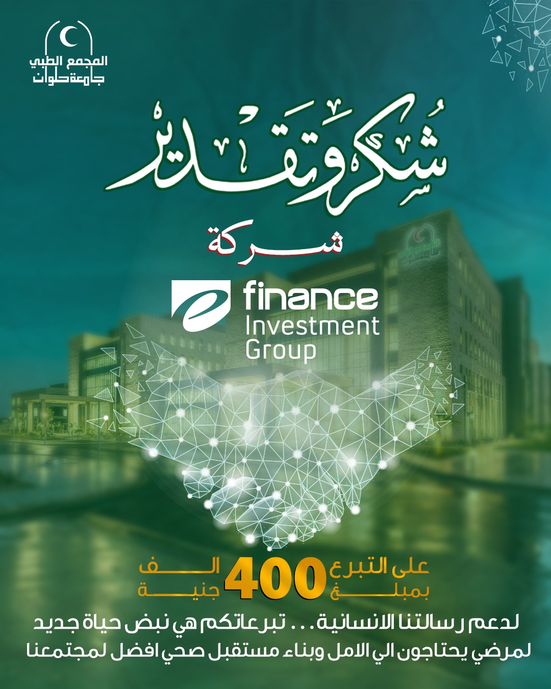 تتقدم إدارة المجمع الطبي جامعة حلوان “جامعة العاصمة حاليا”، بخالص الشكر والتقدير إلى مجموعة شركات اى فاينانس للأستثمارات المالية و الرقمية على دعمها للمجمع الطبي، من خلال تقديم تبرع مالي بقيمة 400 ألف جنيه، في إطار دورها المجتمعي وحرصها على دعم القطاع الصحي والخدمات الطبية المقدمة للمواطنين.