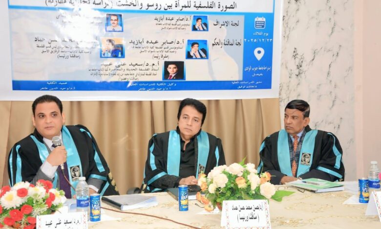 ناقشت كلية الآداب بجامعة قنا (جنوب الوادي سابقًا) رسالة الماجستير المقدمة من الباحثة دينا محمد عبد الحميد، بعنوان: «الصورة الفلسفية للمرأة بين روسو والخشت: دراسة تحليلية مقارنة»، وهي دراسة تتجاوز الطرح التاريخي إلى مساءلة البنى العقلية التي صاغت تصورات الفلاسفة عن المرأة ودورها في المجتمع.