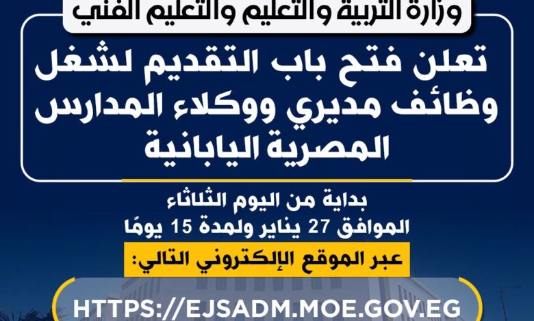 وزارة التربية والتعليم تفتح باب التقديم لوظائف مديري ووكلاء المدارس المصرية اليابانية