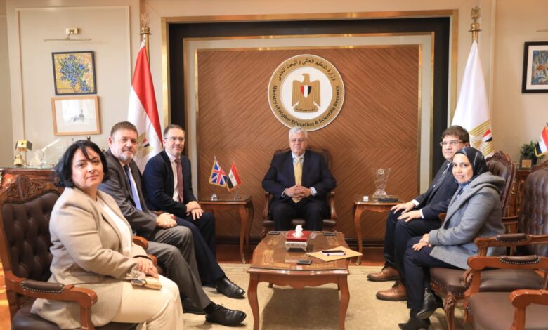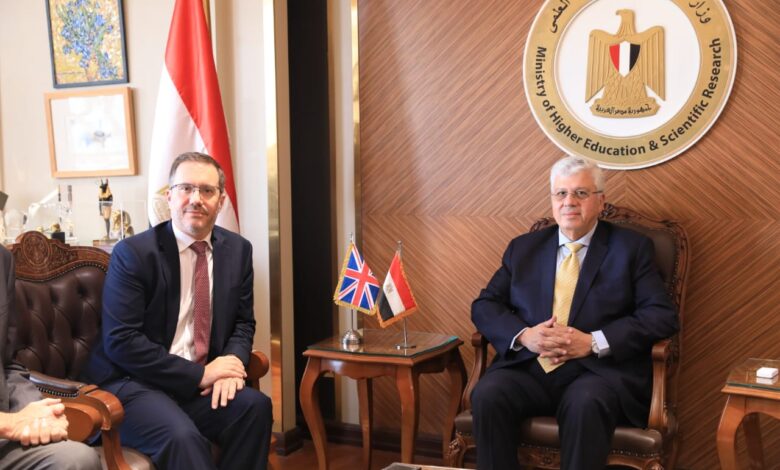 وزير التعليم العالي يلتقي سفير المملكة المتحدة بالقاهرة لتعزيز التعاون في التعليم التكنولوجي والتوسع في الفروع الدولية