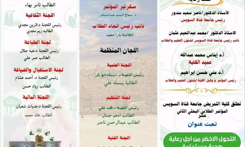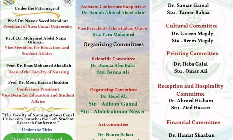 في إطار حرص جامعة قناة السويس على دعم البحث العلمي الطلابي وتعزيز دوره في مواجهة التحديات المعاصرة في القطاع الصحي، تطلق كلية التمريض بجامعة قناة السويس فعاليات المؤتمر الطلابي البحثي الثاني عشر تحت عنوان «التحول الأخضر من أجل رعاية صحية مستدامة»، والمقرر انعقاد جلساته يوم الخميس 2 أبريل 2026، بمشاركة طلابية وبحثية واسعة تهدف إلى تعزيز مفاهيم الاستدامة البيئية في مجال الرعاية الصحية.