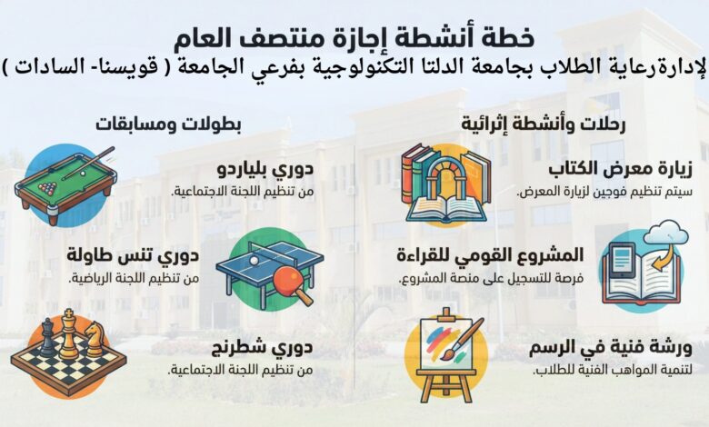 أعلنت جامعة الدلتا التكنولوجية عن خطة الأنشطة الطلابية المقرر تنفيذها خلال إجازة منتصف العام الجامعي، وذلك تحت رعاية الدكتور وجيه…