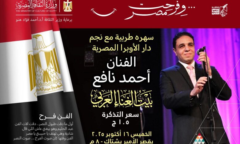 ينظم قطاع صندوق التنمية الثقافية أمسية فنية يحييها الفنان أحمد نافع، في الثامنة من مساء الخميس 16 أكتوبر، وذلك بـ…